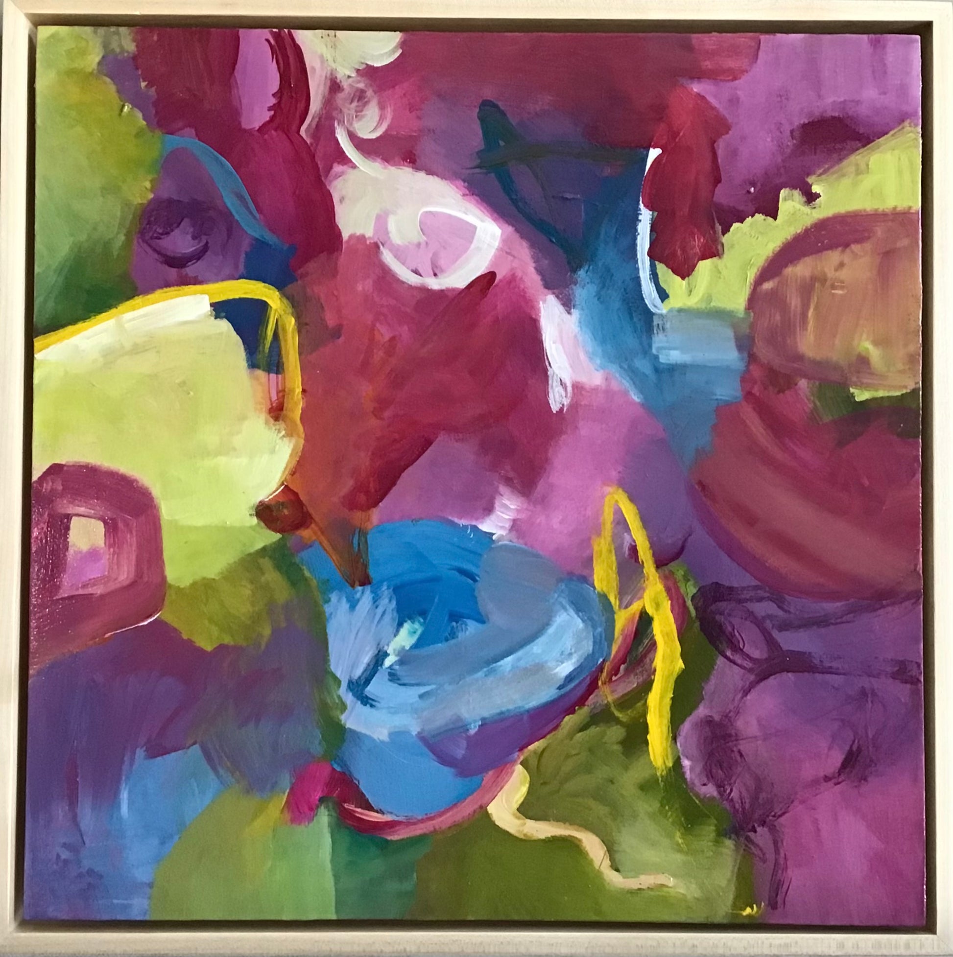 Framed in maple wood floater frame measures 17” x 17” Walnuts splines Gloss varnish.