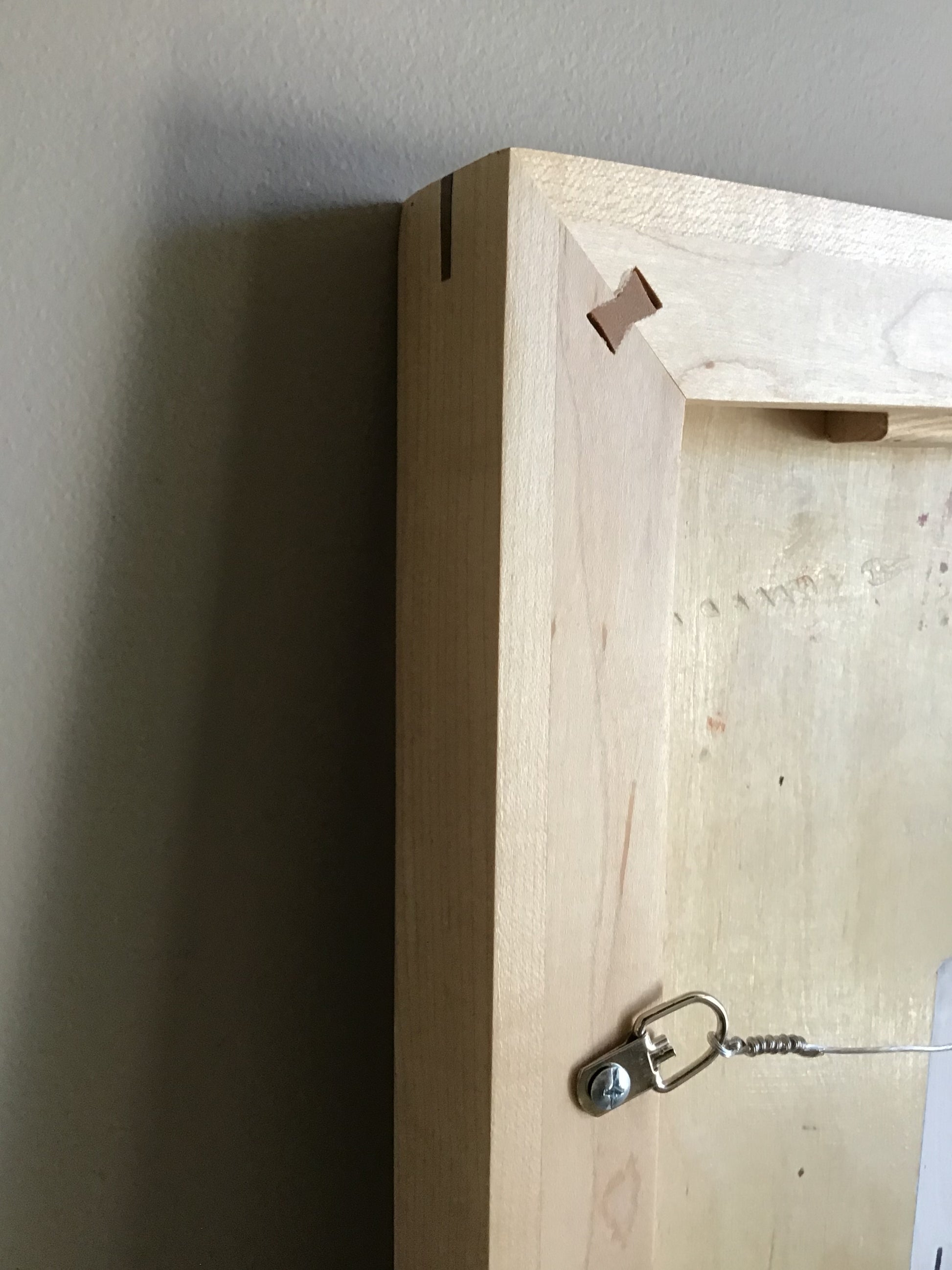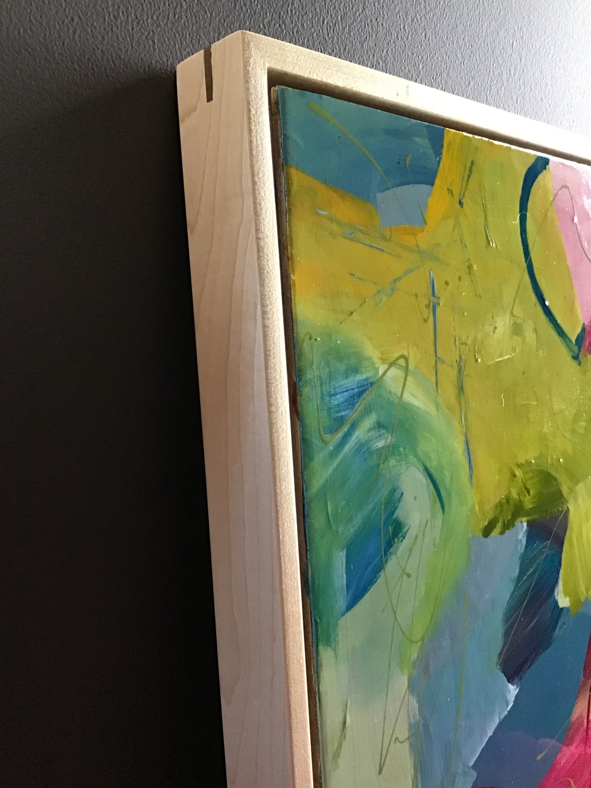 Framed in maple wood floater frame measures 17” x 17” Walnuts splines Gloss varnish.