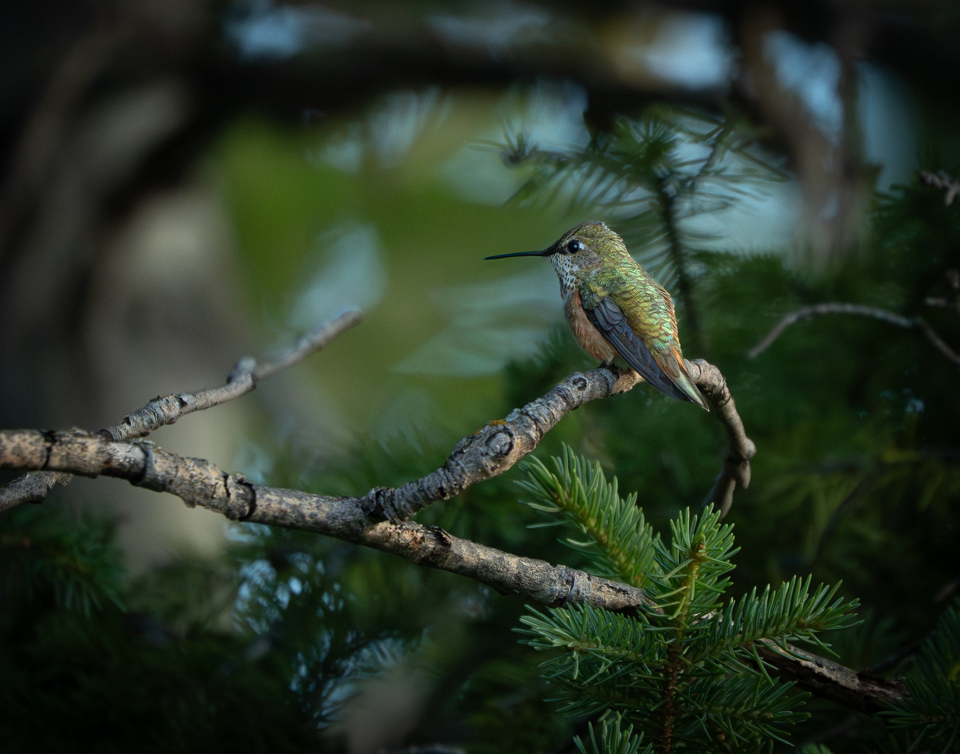 "In the past I have seen glimpses of hummingbirds in Alberta but I had never taken a picture of one here. Costa Rica, yes. I was camping in Southern Alberta and had seen a couple fly by. I thought, "how am I going to take a picture of them?" Well, the answer came later when a big camping trailer pulled up beside where I was sitting by the lake and put up a hummingbird feeder. I probably took a few hundred pictures, but I did finally get him on a quick resting break on this branch."