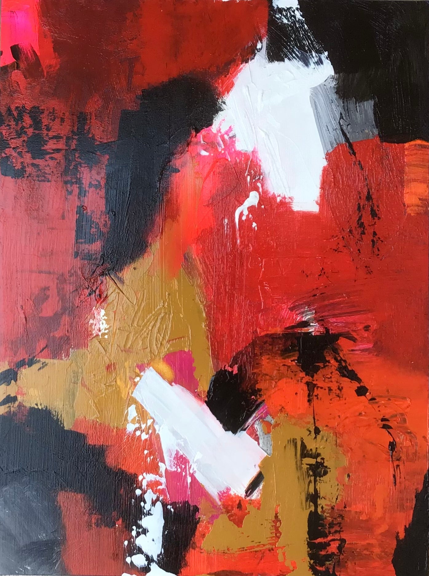 Dominating the canvas are shades of deep red, bright ochre and orange, striking black and bright white which have been applied with expressive, gestural brushstrokes. The paint is layered thickly in some areas, creating a sense of depth and story. The overall composition is both bold and emotive, inviting the viewer to explore the complexity within the abstract forms. Inspired by the heat of summer and the fires that prevail in Alberta and British Columbia during our short season of summer.